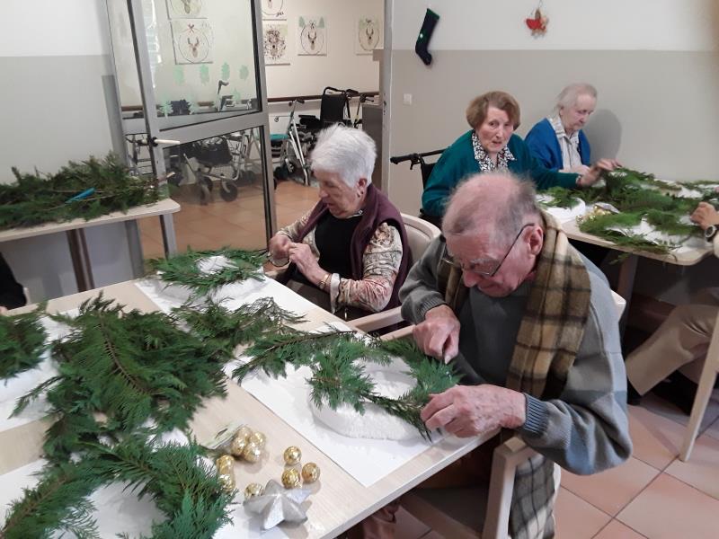 Afin de décorer la résidence et surtout les tables du restaurant, les résidents ont fabriqué, avec l'aide de Nathalie l'animatrice, des couronnes végétales pour faire office de centre de table.