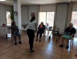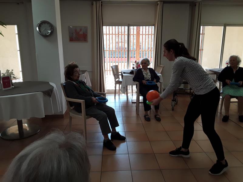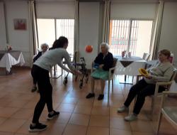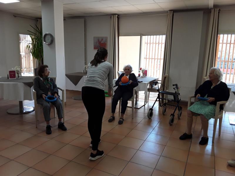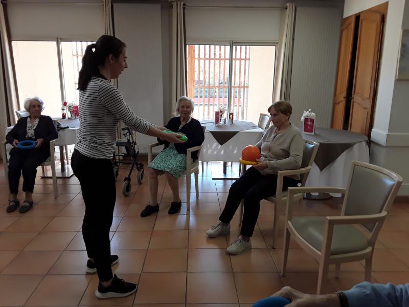 Cela permet de maintenir la forme physique, la motricité, la mémoire et cela favorise aussi le lien social car ces cours de gym douce se font en groupe. Les résidents sont très sérieux jusqu'au moment ou le fou rire prend le groupe !