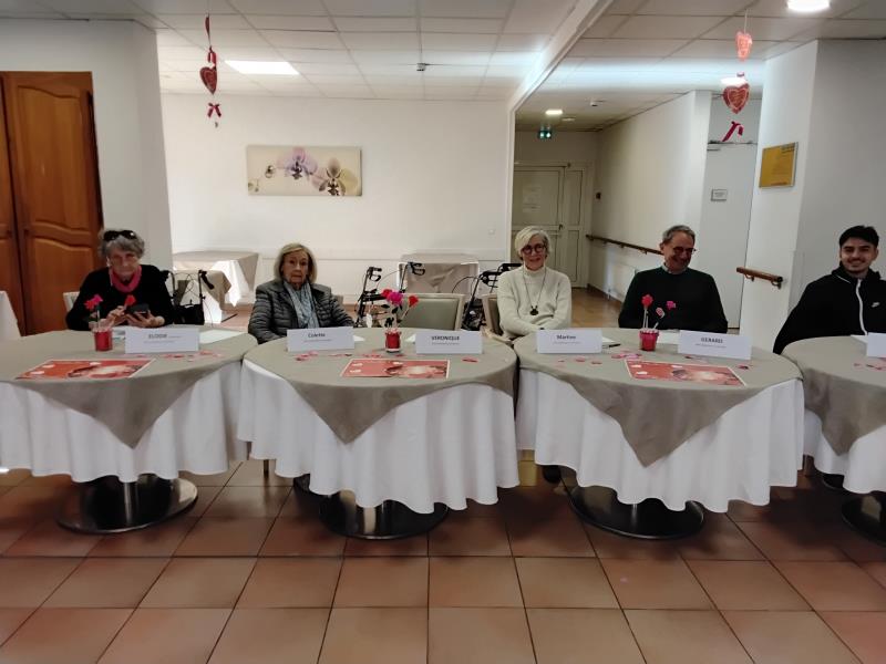concours à la résidence, les résidents ont confectionné et personnalisé leurs sets de table, les jurys leur ont attribué une note et voici le résultat : Mr Albinet André 1er se verra remettre un bon pour le coiffeur,Mme Magnaudeix 2ème se verra remettre un soin du visage, Mme Guibora et Mr Bert 3ème se verront remettre des trousses de toilette, chaque résident se verra remettre un petit cadeau de consolation. Merci, à tous les jurys présents formés initialement de familles. Merci pour votre présence et votre temps pour nos aînés. Une belle journée très émouvante pour les histoires d'amour de nos anciens. 😘😘😘😘😘
